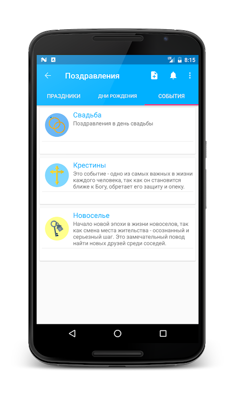 È sempre possibile aggiungere le feste ed eventi. E l'applicazione mostrerà quanti giorni fino a quando l'evento o una festa! Così come si notificare in anticipo della vacanza si avvicinava. Ora che non dimenticherete mai congratularmi con amici e parenti. È possibile scegliere i saluti voluto e inviare un SMS o tramite le applicazioni installate e le reti sociali. È inoltre possibile modificare il testo prima di inviare congratulazioni.