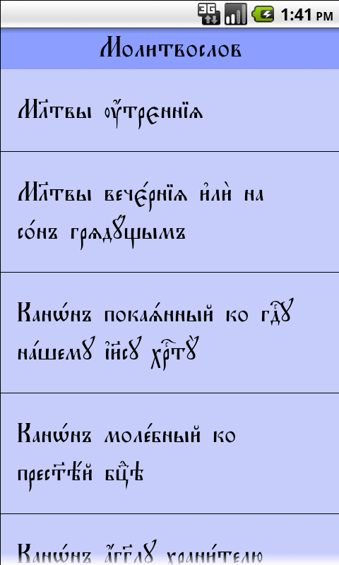Tutte le impostazioni per questa applicazione vengono effettuate tramite il menu. Se il pulsante del menu non viene visualizzato sul telefono, puoi chiamare il menu in un altro modo. Per le pagine con elenchi - è necessario fare clic sul titolo dell'elenco, per le pagine con il testo delle preghiere - è necessario fare clic nell'angolo in alto a sinistra della finestra.