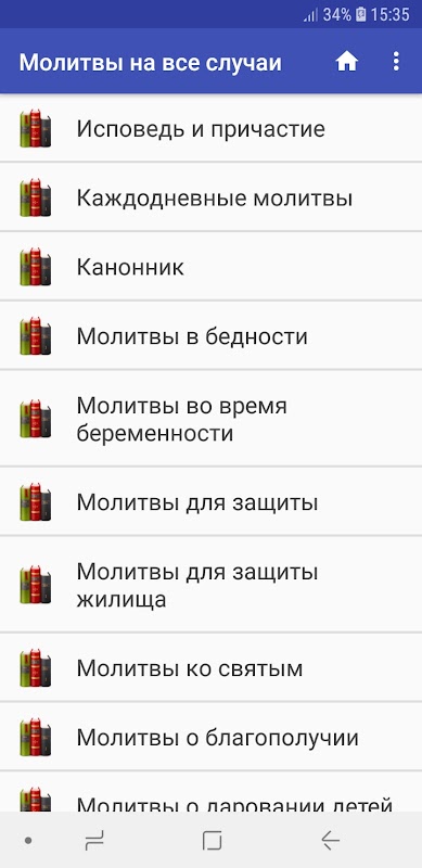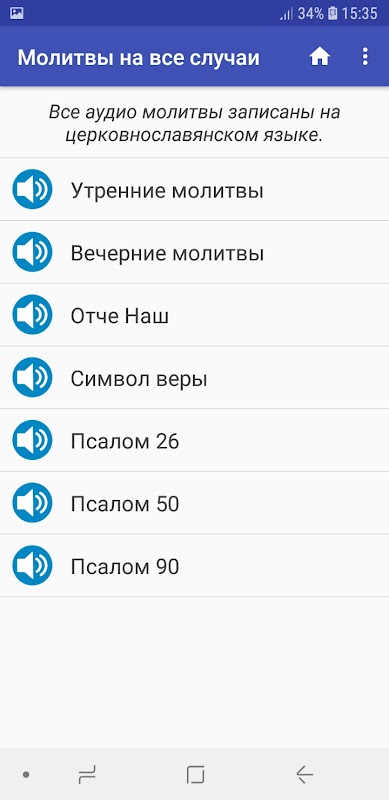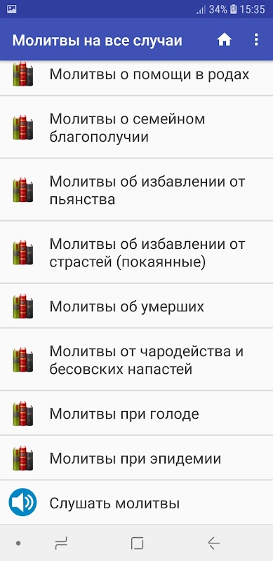 Questa applicazione contiene le preghiere ortodosse più comuni che vengono utilizzate più spesso dalle persone nella vita di tutti i giorni. Ad esempio, preghiere per la salute, per il successo negli affari, per sbarazzarsi del deterioramento e molti altri. Ti consigliamo di installare l'applicazione e vedere di persona. Se pensi di dover aggiungere qualche nuova preghiera all'applicazione, quindi scrivici nei commenti, lo faremo. Preghiere all'angelo custode, preghiere per buona fortuna e successo, preghiere a Nicholas the Wonderworker: troverai tutto questo e molto altro in questa applicazione. Raccolto solo il più necessario, funziona senza Internet. Scarica l'applicazione e assicurati che sia ottimale per tutte le occasioni. Tutte le preghiere sono in russo moderno, l'adattamento dallo slavo ecclesiastico è tratto dai libri di preghiere. All'applicazione è stata aggiunta una sezione con le preghiere audio, le più necessarie.