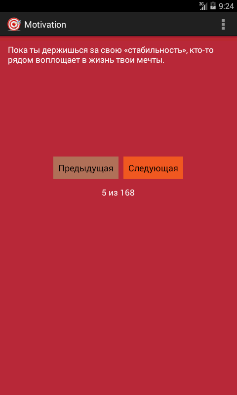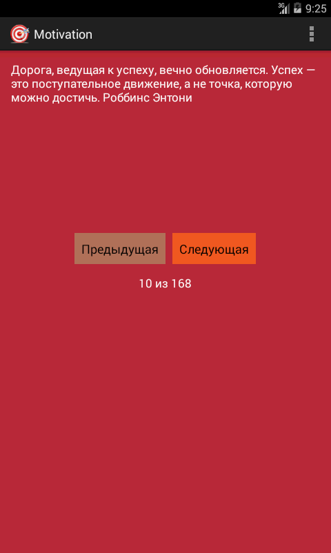 Приложение - сборник мотивирующих фраз и высказываний известных бизнесменов, тренеров и других успешных людей. Приложение регулярно обновляется и пополняется новыми фразами.