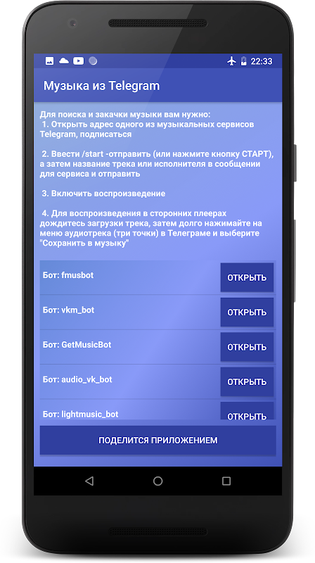 - Приложение поможет вам использовать мессенджер Телеграм для прослушивания бесплатной музыки, поиска музыкальных коллекций и композиций