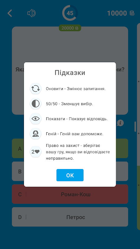 "New Millionaire Ukraine" è un entusiasmante gioco gratuito per tutte le età. Ti aspettano domande interessanti, un nuovo design, un'interfaccia semplice e comoda.