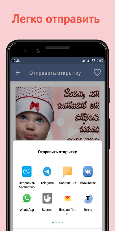 Прямая отправка в такие мессенджеры как Viber, Whatsap, Telegram, Vkontakte и Одноклассники (ок) позволяет отправить поздравительную открытку в один клик.