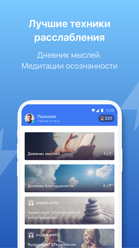 Per comodità degli utenti, viene offerta la possibilità di connettere una chat a pagamento con uno psicologo direttamente nell'applicazione: consultazioni testuali per 1 settimana o 1 mese risolveranno tutti i problemi personali e miglioreranno l'effetto del programma. Impieghiamo solo terapisti cognitivo-comportamentali con istruzione superiore specializzata ed esperienza lavorativa nella specialità da 7 a 26 anni.