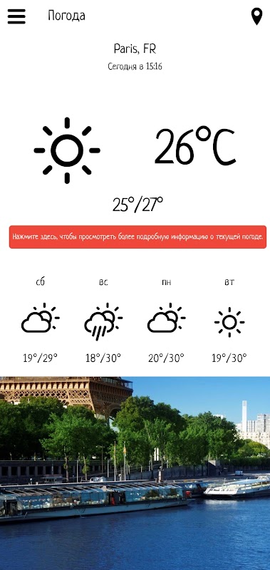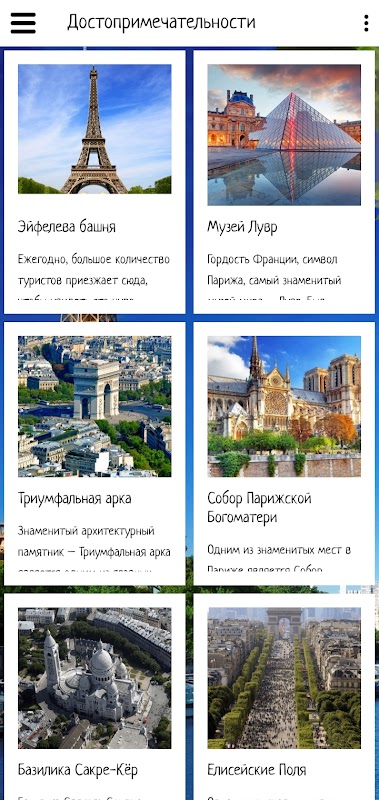 In questa applicazione, puoi fare una prima conoscenza con Parigi, scegliere un luogo in cui viaggiare guardando i luoghi e le recensioni video. L'applicazione contiene anche informazioni sulle agenzie di viaggio e sugli hotel che offrono i loro servizi a Parigi.