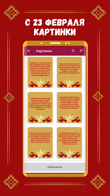 L'applicazione congratulazioni del 23 febbraio è molto semplice e facile da usare. Puoi scaricare qualsiasi cartolina e condividerla immediatamente tramite i social network. Puoi anche salvare la cartolina sul tuo dispositivo.