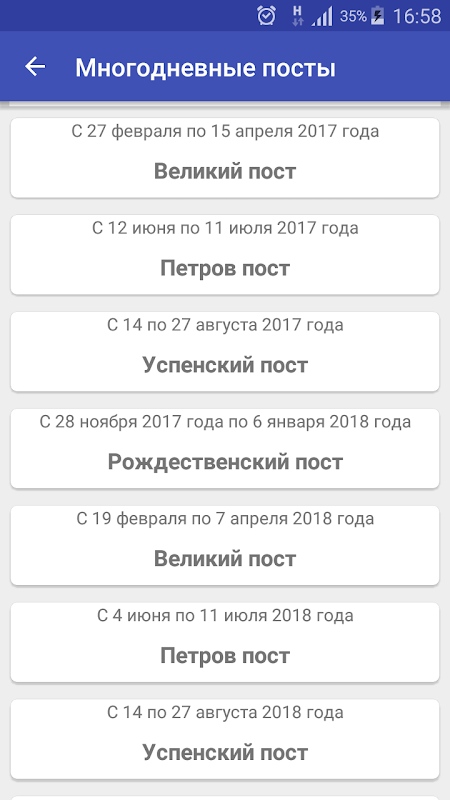 Календарь можно листать месяц за месяцем, и, нажав интересующую дату, увидеть информацию о выбранном дне. Также есть возможность просмотреть отдельными списками Великие праздники, Дни особого поминовения усопших, многодневные посты, сплошные седмицы.