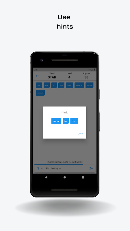 In questo gioco il tuo obiettivo è trovare 10 rime per una determinata parola per avanzare al livello successivo. Puoi anche metterti alla prova stabilendo un record per il maggior numero di rime trovate per una singola parola. "Trova la rima" non è solo un passatempo divertente ma anche un ottimo modo per espandere il tuo vocabolario, sviluppare abilità linguistiche e migliorare il pensiero creativo.