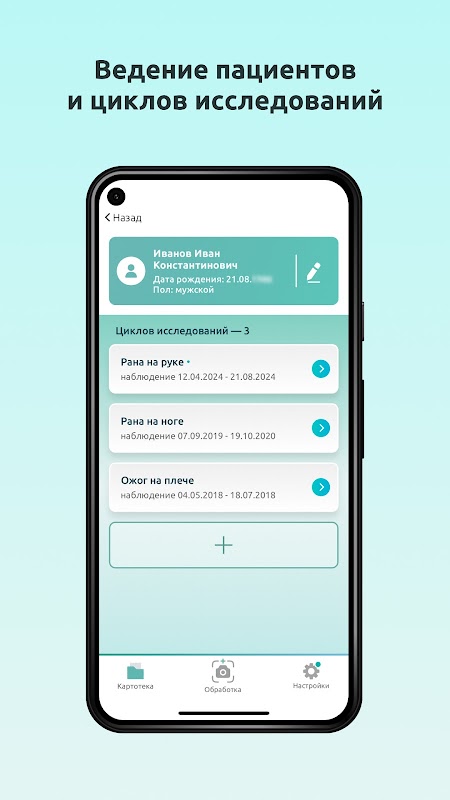 L'applicazione consente di conservare una scheda paziente, in cui vengono visualizzati i risultati dei singoli studi e la dinamica complessiva della guarigione. In ogni fase vengono forniti suggerimenti per la scelta dei trattamenti locali.