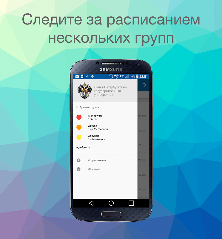 Удобное и красивое приложение-расписание для студентов и преподавателей СПбГУ с возможностью отслеживать расписание сразу нескольких групп.