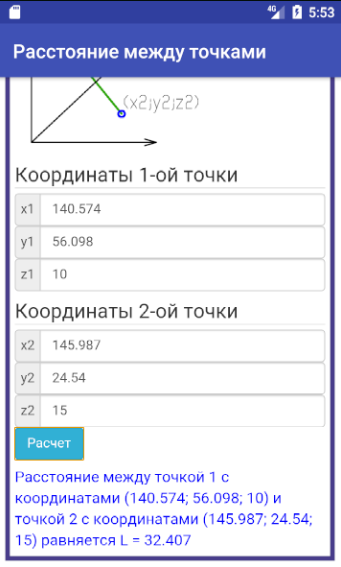 Результат будет показан ниже в виде расстояния L между заданными точками.