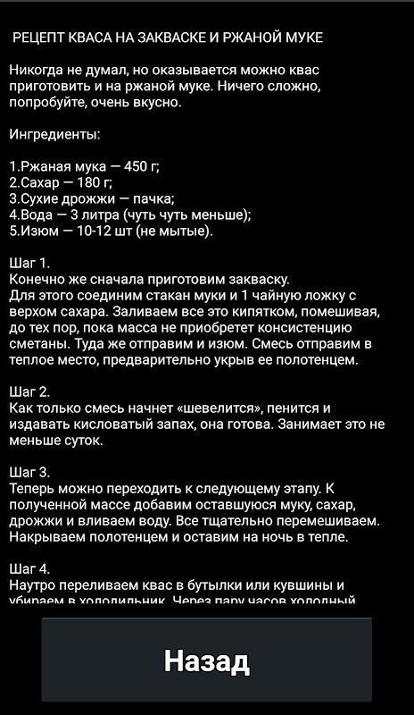 С помощью нашего приложения вы сможете приготовить вкусный квас в домашних условиях. В приложении представлены самые популярные и проверенные рецепты кваса из хлеба, с дрожжами и без дрожжей, а так же вкуснейший рецепт яблочного кваса.