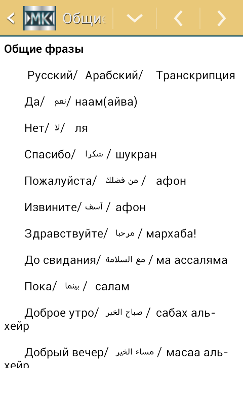 Русско-арабский разговорник. Предположим, вы приехали в другую страну и совершенно не владеете местным языком. Для того, чтобы проще общаться за рубежом и чувствовать себя как дома, предлагаем пролистать перед поездкой разговорник. В данном разговорнике вы найдете общие фразы и фразы на темы гостиница, магазин (покупки), транспорт, экстренные случаи, ресторан.