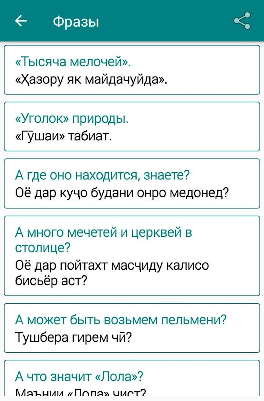 Русско-таджикский разговорник содержит более 2000 выражений. Разговорник подходит как таджикам на территории России, так и русскоязычным на территории Таджикистана. Обновленная версия классического разговорника таджикского языка состоит из более 2000 выражений. В разговорнике существуют такие темы как: речевой этикет, информация о человеке, город, медицинское обслуживание, здравоохранение, культура, искусство, литература, промышленность, сельское хозяйство, наука, просвещение, пресса, радио, телевидение, счёт, деньги, мера, вес,