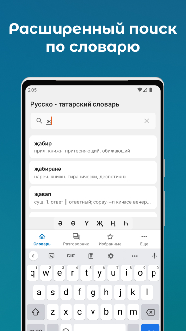 C'è una funzione di ricerca per trovare rapidamente la parola che ti serve in due lingue contemporaneamente. Non è necessario scegliere russo-tartaro o tartaro-russo. Inserisci le parole nella ricerca sia in russo che in tartaro.