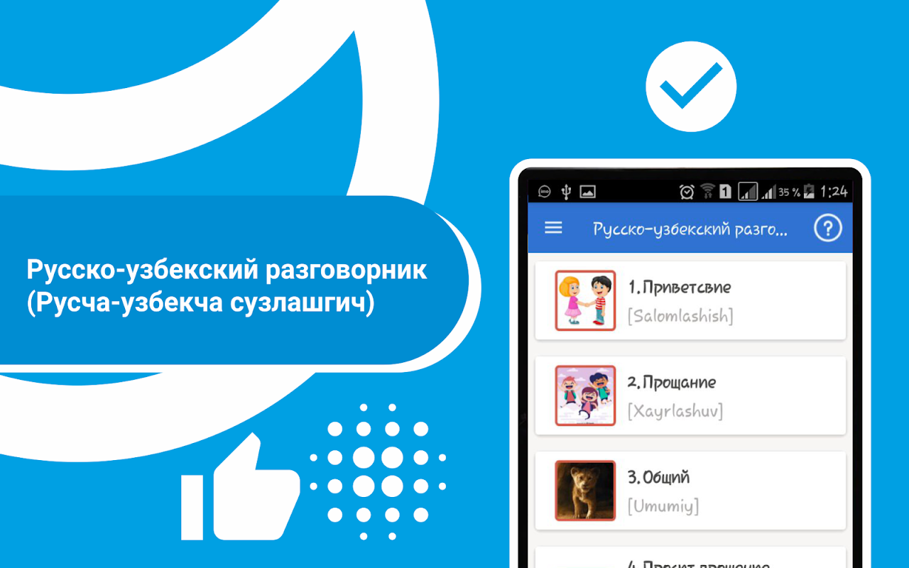 Русско- узбекский разговорник (узбекско-русский разговорник - русча узбекча сузлашгич) содержит более 3000 фраз, которые отсортированы и сгруппированы по темам с изображениями. Самое главное Русско- узбекский разговорник (узбекско-русский разговорник - русча узбекча сузлашгич) произношение фразы на русском языке, это функция позволяет изучать русский язык с правильным произношением.
