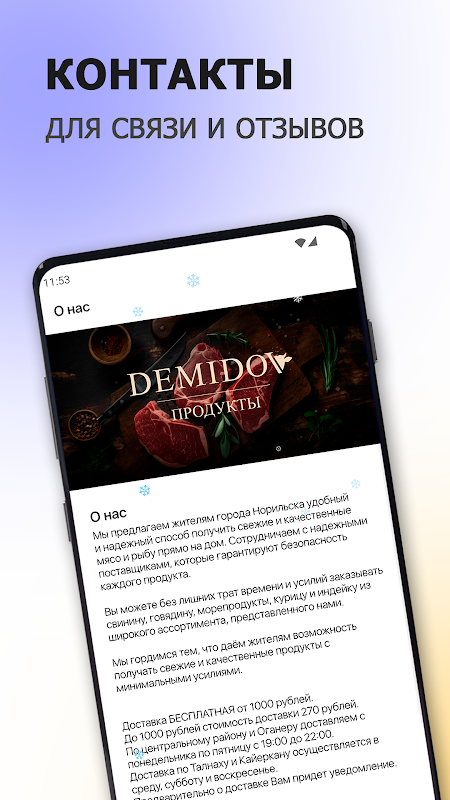 Siamo orgogliosi di offrire ai residenti di Norilsk l'opportunità di ricevere prodotti freschi e di alta qualità con il minimo sforzo. Scarica subito la nostra applicazione "Prodotti Demidov" e goditi ogni giorno prodotti deliziosi e sani!