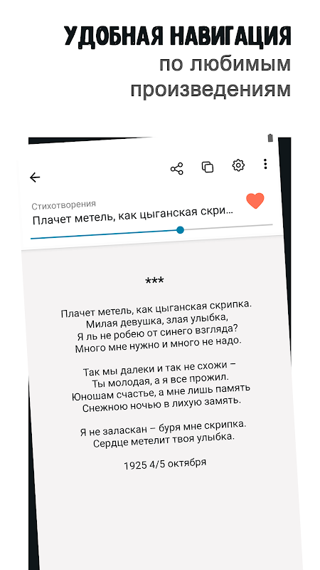 La raccolta di poesie e poesie è piena dell'atmosfera unica insita nelle opere di Sergei Yesenin. Se ti piace leggere poesie di poeti russi, allora questa app è per te. Sergei Yesenin e la sua poesia senza Internet sull'amore con significato, sulla vita, sulla morte, su parenti e amici, sulla natura, sugli animali e molto altro.