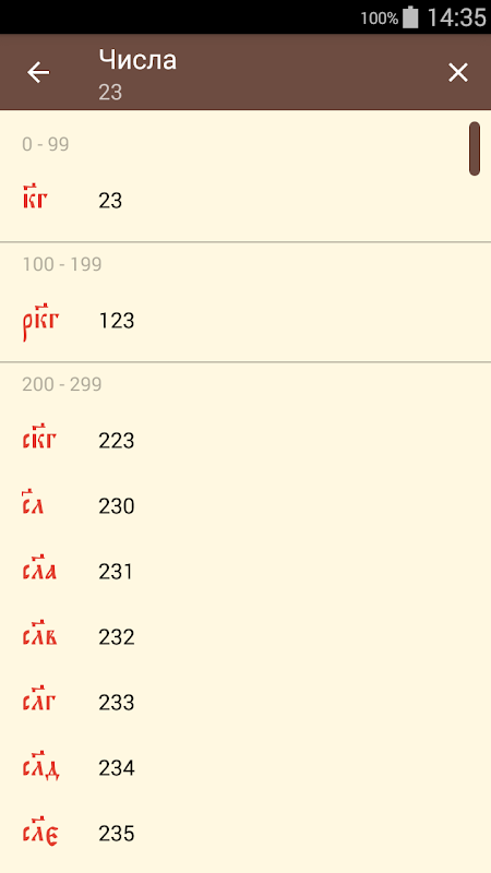 Inoltre, l'applicazione contiene materiali di riferimento sull'alfabeto slavo ecclesiastico e sulle caratteristiche della scrittura dei numeri slavi ecclesiastici.