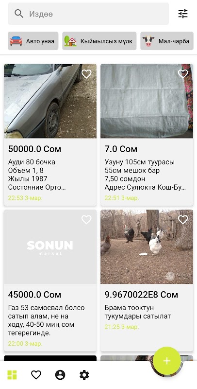"Сонун Маркет" жарыялар тиркемеси - Кадамжай районунун жана Кызыл-Кыя шаарынын тургундары үчүн атайын даярдалган, жарыялардан кабардар кылып туруучу заманбап тиркеме. Бул тиркемеде өтө көп өзгөчөлүктөр бар. Издөө жана фильтр функциялары жакшырды. Андан башка Ар бир жарыя сизге келип, тынчыңызды албоосу үчүн уведомление баскычын өчүрүп койсоңуз болот. Баарынан да сиз өзүңүздүн жарыяңызды түздөн-түз жүктөй аласыз жана өзүңүздүн жарыяңызды башкара аласыз. Ошондой эле ыңгайлуулук үчүн көптөгөн категориялар, подкатегориялар камтылды.