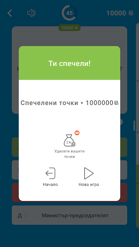 Proprio come ti aspetteresti nei famosi programmi TV, devi rispondere alle domande in bulgaro e scalare il percorso dell'albero dei soldi per diventare il miglior milionario virtuale della Bulgaria.