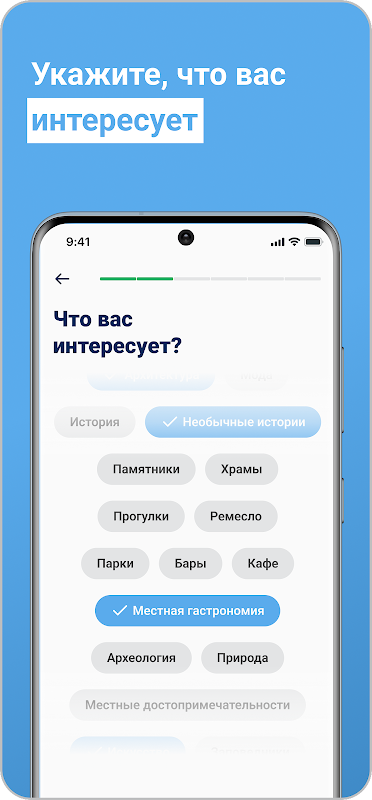 Annota i tuoi interessi, le condizioni di viaggio e la quantità di tempo libero. Sulla base di questo, Susanin troverà qualcosa da fare per te in qualsiasi città. Non indovinare se ti piacerà o no, ma sentiti libero di seguire il tuo percorso personale.