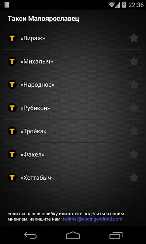 Приложение отображает номера телефонов такси по городу Малоярославец (Калужская область).