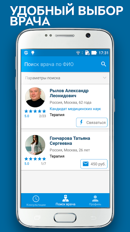 Выберите врача с помощью удобного фильтра и свяжитесь с ним при помощи текстовой консультации, телефонного звонка или видеосвязи!