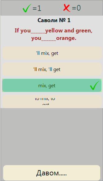 Тест аз забони англисӣ(2018). Барнома дорои 3000 саволу ҷавобҳои навтарин аз фанни забони англисӣ мебошад Ҳисоботи рейтинги дар шакли ҷадвал ва графика. Беҳтарин восита барои довталабони ИМТ мебошад. Марҳамат барномаро санҷед ва ба шумо писанд ояд метавонед шакли пурраи онро харидорӣ намоед. Маркази барномасозии TojikSoft кӯшишу ғайрати худро баҳри шумо ҳамватанон гиромӣ дареғ намедорад. Барномаҳои моро харидорӣ кунед ва моро дастгирӣ кунед. Мо омода ҳастем то беҳтарин барномаҳоро дар забони тоҷикӣ дар шакли беҳтарин барои шумо пешкаш намоем.