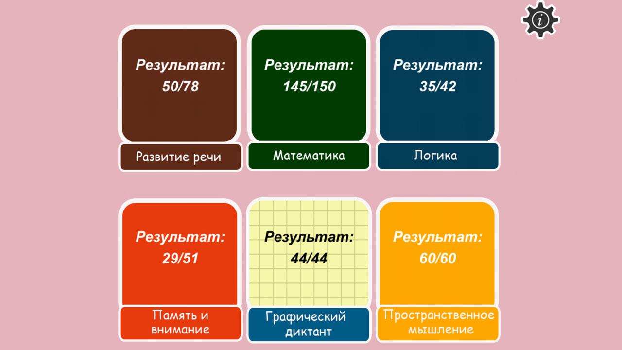 Come risultato di testare i genitori ricevono una valutazione indipendente delle capacità del bambino. Con il passaggio di tutti i moduli sarà offerta una caratteristica dettagliata dell'intelligenza della futura prima elementare.