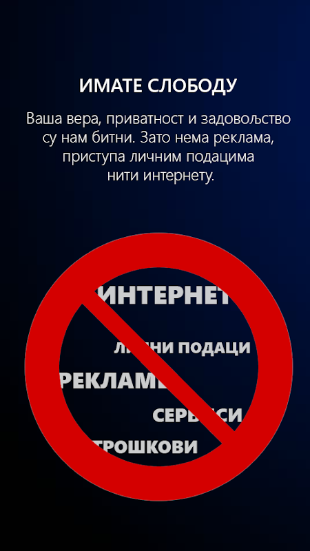 † брига о духовности – ваша вера, приватност и сигурност су на првом месту. Када знате да за коришћење нису потребни ваши подаци, дозволе, приступ интернету или другим сервисима нити додатна плаћања, можете се у потпуности посветити садржају