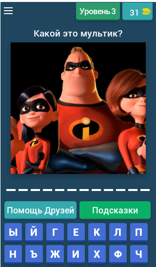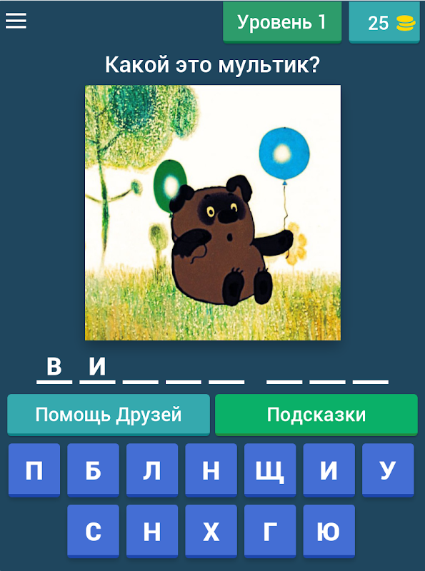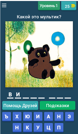 Indovina personaggi famosi dei cartoni animati, così come i cartoni stessi. Conosci il fumetto? Non importa, l'app contiene suggerimenti: apri una lettera, rimuovi le lettere non necessarie e completa il livello! Chiama i tuoi amici e attraversa livelli entusiasmanti con loro.