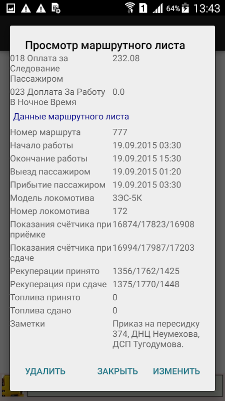 Inoltre nell'applicazione puoi salvare quasi tutti i dati del foglio del percorso: dati sui contatori di elettricità, carburante, informazioni sui treni, informazioni sul passeggero, c'è un campo per le note.