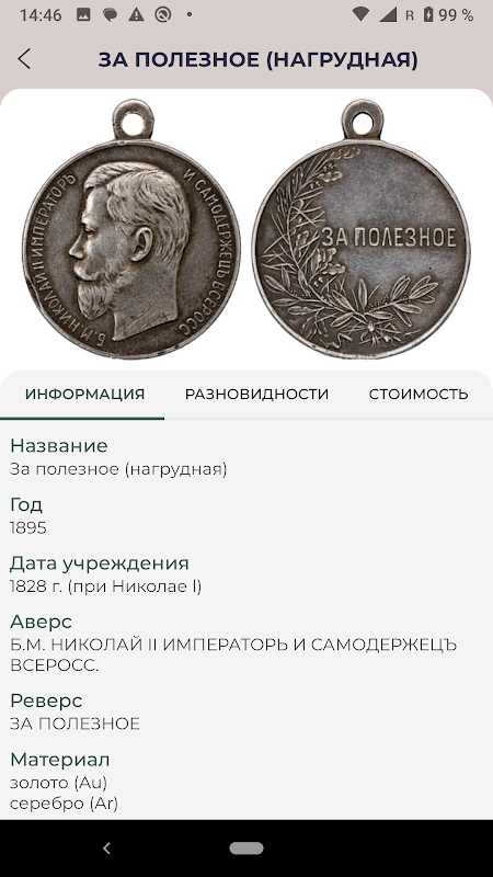 L'applicazione mobile Faleristics è un catalogo di medaglie, ordini, distintivi, distintivi, ecc. Di diversi periodi di tempo da Paolo I al periodo sovietico. Per ogni premio viene indicata la massima informazione possibile, nonché il numero di cataloghi noti di Bitkin V.V., Dyakov M.E., Smirnov V.P. L'applicazione implementa una ricerca per nome del premio, che semplifica la ricerca di un premio in questo catalogo Le foto dei premi sono presentate in buona qualità con la possibilità di aumentare. Nella nostra applicazione sarai in grado di fare premi dalla tua collezione.