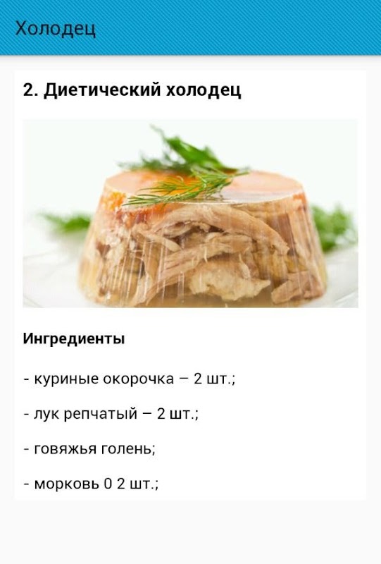 Холодец - блюдо из сгустившегося до желеобразной массы от охлаждения мясного бульона с кусочками мяса. Известен с XVI века Холодец не является разновидностью заливного, так как желеобразная консистенция заливных блюд является следствием использования желеобразующих веществ, таких, как желатин и агар-агар, а холодец является самостоятельным блюдом, не требующим добавок.