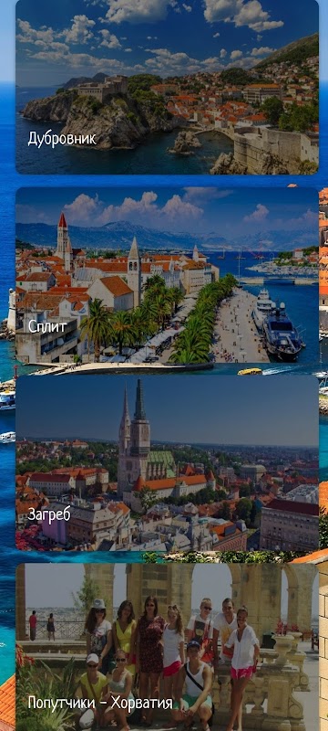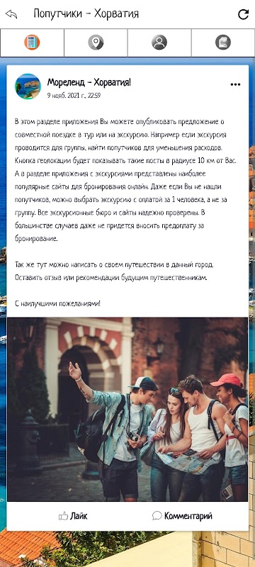 C'è una situazione in cui viaggi da solo o in coppia e vuoi fare un'escursione interessante, ma è costosa, poiché la guida addebita al gruppo. In questa applicazione puoi trovare compagni di viaggio per escursioni congiunte e ridurre il costo del tour. Nella sezione "Viaggiatori" dell'applicazione, pubblica il tuo post e sarà visibile agli altri utenti dell'applicazione entro un raggio di 10 chilometri. E quando fai clic sull'icona "geolocalizzazione", tu stesso puoi vedere altre offerte simili entro un raggio di 10 chilometri da te! Inoltre, nell'applicazione, puoi fare una prima conoscenza con le città della Croazia, scegliere un posto dove viaggiare guardando le attrazioni e le recensioni video. Anche nell'applicazione ci sono informazioni su agenzie turistiche, agenzie di viaggio e hotel che offrono i loro servizi in Croazia.