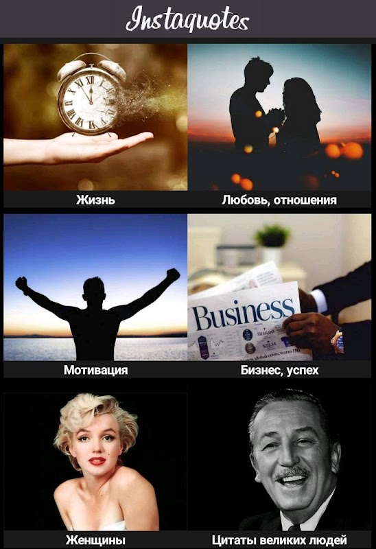 * Le citazioni sono divise in titoli: citazioni sulla vita, amore e relazioni, donne, e anche - motivazione, affari, successo e citazioni di grandi persone.