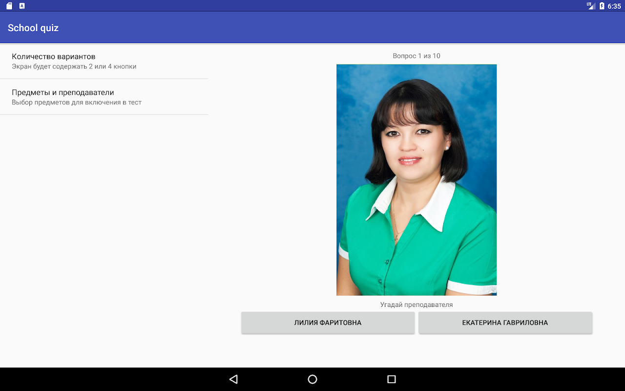 Это приложение разработано для того, чтобы Вы могли проверить себя на знание имён преподавателей школы №6. А также для того, чтобы узнать, как зовут других учителей.