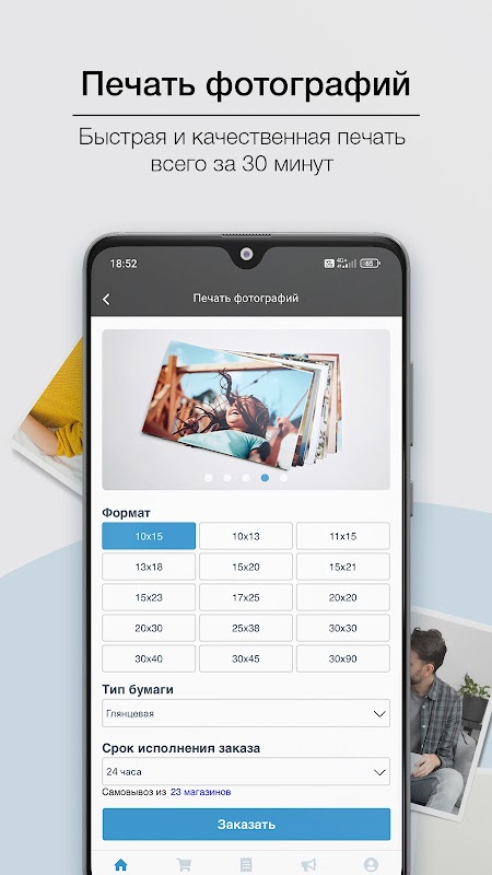 Stampa classica di fotografie di qualsiasi formato, stampa su tela e arrotolamento su cartone espanso, foto per documenti, calendari fotografici di vario tipo, souvenir fotografici, stampa e libri fotografici: tutto questo puoi ordinarlo nella nostra applicazione.