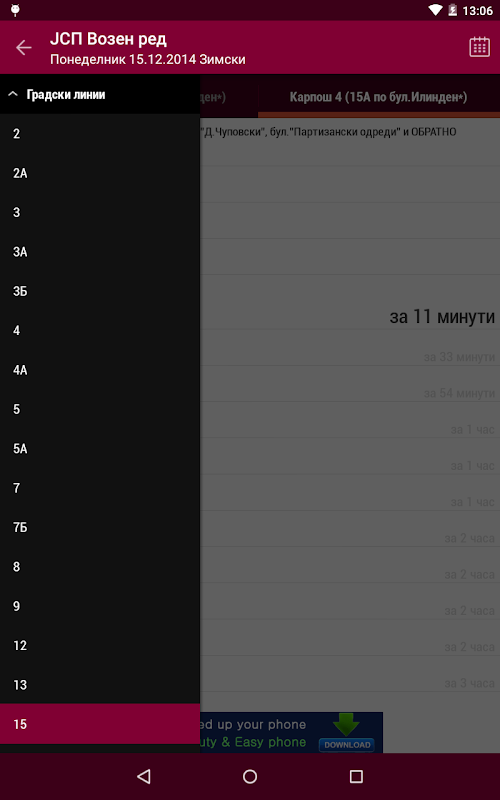 ЈСП Возен ред (JSP dell'orario) è l'unica applicazione che vi serve, in modo da non perdere l'autobus dei trasporti della città. I dati per le linee è tempestivamente e accuratamente aggiornato dalla pagina web ufficiale JSP (www.jsp.com.mk).