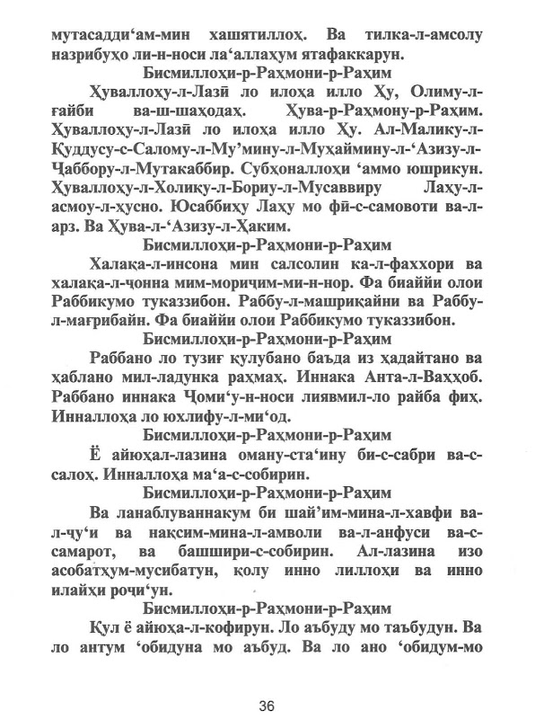 Сураҳо, Қуръон, Намоз, Ёсин, Таборак, Фотиҳа, Сураи НОС (Мардум), Сураи ФАЛАҚ (субҳгоҳ), Сураи Ихлос, Сураи ЛАҲАБ (Оташ), Сураи Наср, Сураи Кофирун, Сураи Кавсар, Сураи Моъун, Сураи Қурайш, Сураи Фил, Сураи ҲУМАЗА (Айбҷӯ), Сураи АСР (Замон), Сураи ТАКОСУР (Афзунхоҳӣ), Сураи ҚОРИЪАҲ (Кӯбанда), Сураи ОДИЁТ (Аспони даванда), Сураи ЗИЛЗОЛ (Ларзиш), Сураи БАЙЙИНА (Бурҳони равшан), Сураи ҚАДР (Тақдир), Сураи ТИН (Анҷир), Сураи Иншироҳ, Сураи ЗУҲО (Оғози рӯз), Сураи ЛАЙЛ (Шаб), Сураи ШАМС (офтоб), Сураи ТОРИҚ (Он чӣ дар шаб ояд), Сураи Ъамма (Хабар), Сураи Таборак, Сураи Ёсин