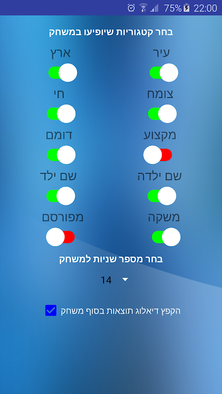 במשחק ארץ עיר יש קטגוריות רבות ולכם יש שליטה מלאה מה להציג מבין 10 אפשרויות,
