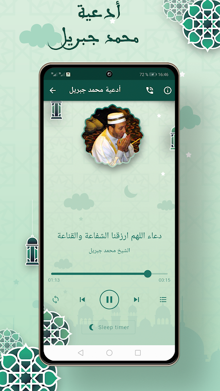La trasmissione dell'applicazione Muhammad Jibril senza la rete, alta qualità per lo sfondo, nel caso in cui si riceva una telefonata, per poi continuare ad ascoltare dopo che la chiamata è stata completata.