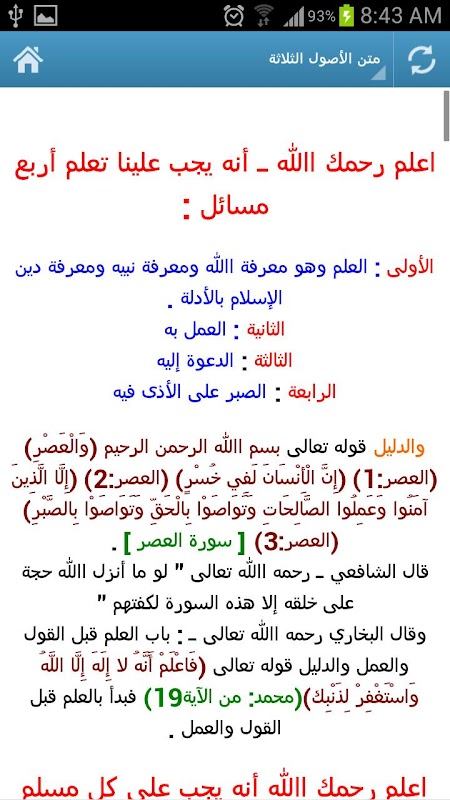 متن الاصول الثلاثة او الثلاثة الاصول للشيخ المجدد محمد بن عبدالوهاب التميمي و نصي قابل للقراءة من الهاتف مباشرة وملون