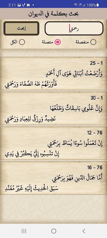 Puoi cercare in Al-Wasl Syrup per parola o visualizzare una poesia specifica.In entrambi i casi, dopo aver visualizzato il risultato della ricerca, puoi premere un attimo sulla casa che vuoi salvare negli appunti e poi incollarla in qualsiasi altra applicazione allo scopo di condividerla o scriverne.