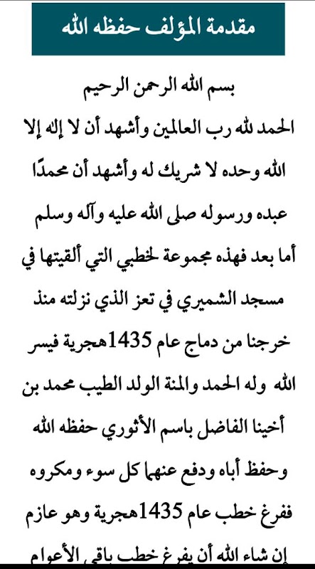 Nel Nome di Dio, il Compassionevole, il Compassionevole, Sia lode a Dio, Signore dei Mondi, e rendo testimonianza che non c'è dio all'infuori di Dio, e che Maometto è il Suo Servo e Messaggero, possano le preghiere di Dio e la pace essere su Per quanto riguarda quanto segue: Questa è una raccolta di sermoni del virtuoso sceicco: Abd al-Rahman al-Shamiri, che tenne nella Moschea al-Shamiri a Taiz, dove rimase dalla sua partenza da Dammaj nel 1435 AH Possa Dio rendere facile per lui, lode e grazia, il bravo ragazzo, Muhammad bin nostro fratello, scrivere questi discorsi per l'anno 1435 AH, ed è determinato, a Dio piacendo, a scrivere i restanti discorsi per il resto degli anni che non erano finiti.
