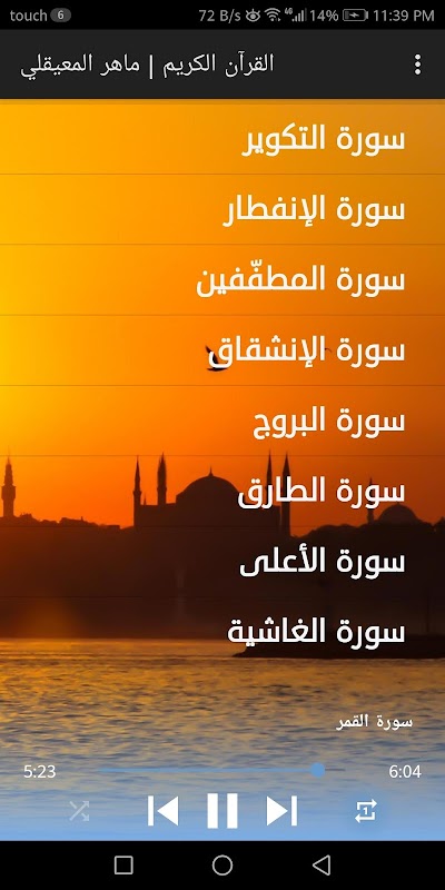 Ora puoi utilizzare l'applicazione con facilità e ascoltare la sura del Nobile Corano con la voce dello sceicco Maher Al-Muaiqly e vivere un meraviglioso caso di fede in cui approfondisci i significati del Nobile Corano, godendoti la voce dello sceicco Maher Al-Muaiqly, che ti trasporta in un altro mondo con la sua voce distintiva.