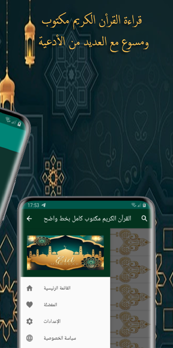 L'interfaccia dell'applicazione del Sacro Corano è completa, scritta e udibile, in modo che tu possa usarla con comodità,