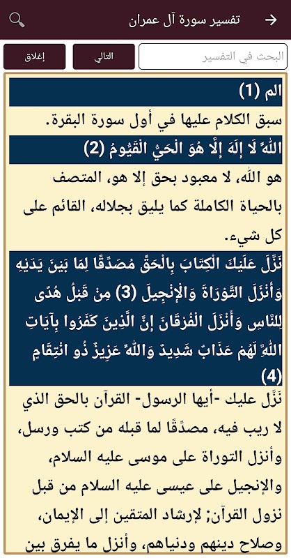 Premendo il pulsante (Sura successiva) e (Sura precedente) è possibile ascoltare le sura precedenti della sura che si sta ascoltando, nonché le sura successive.Il programma mostra anche la durata di ciascuna sura in modo da essere consapevole di questo.