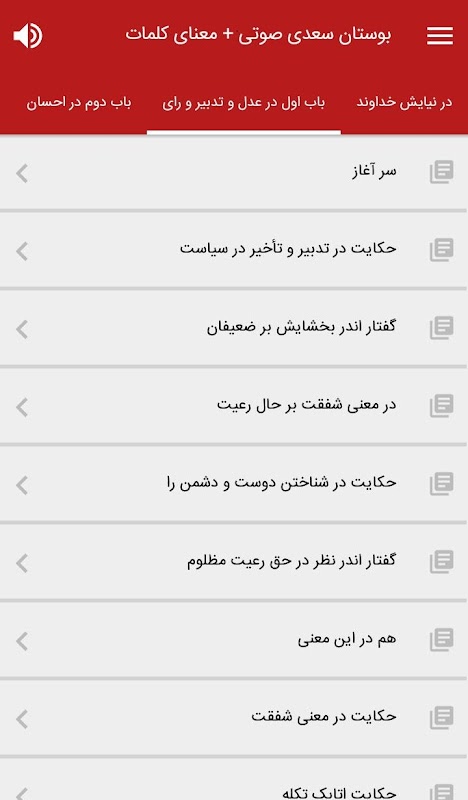 نکته: در نسخه رایگان، به باب اول بوستان دسترسی دارید و برای دسترسی به همه محتوای برنامه، نیاز به خرید نسخه کامل می باشد.